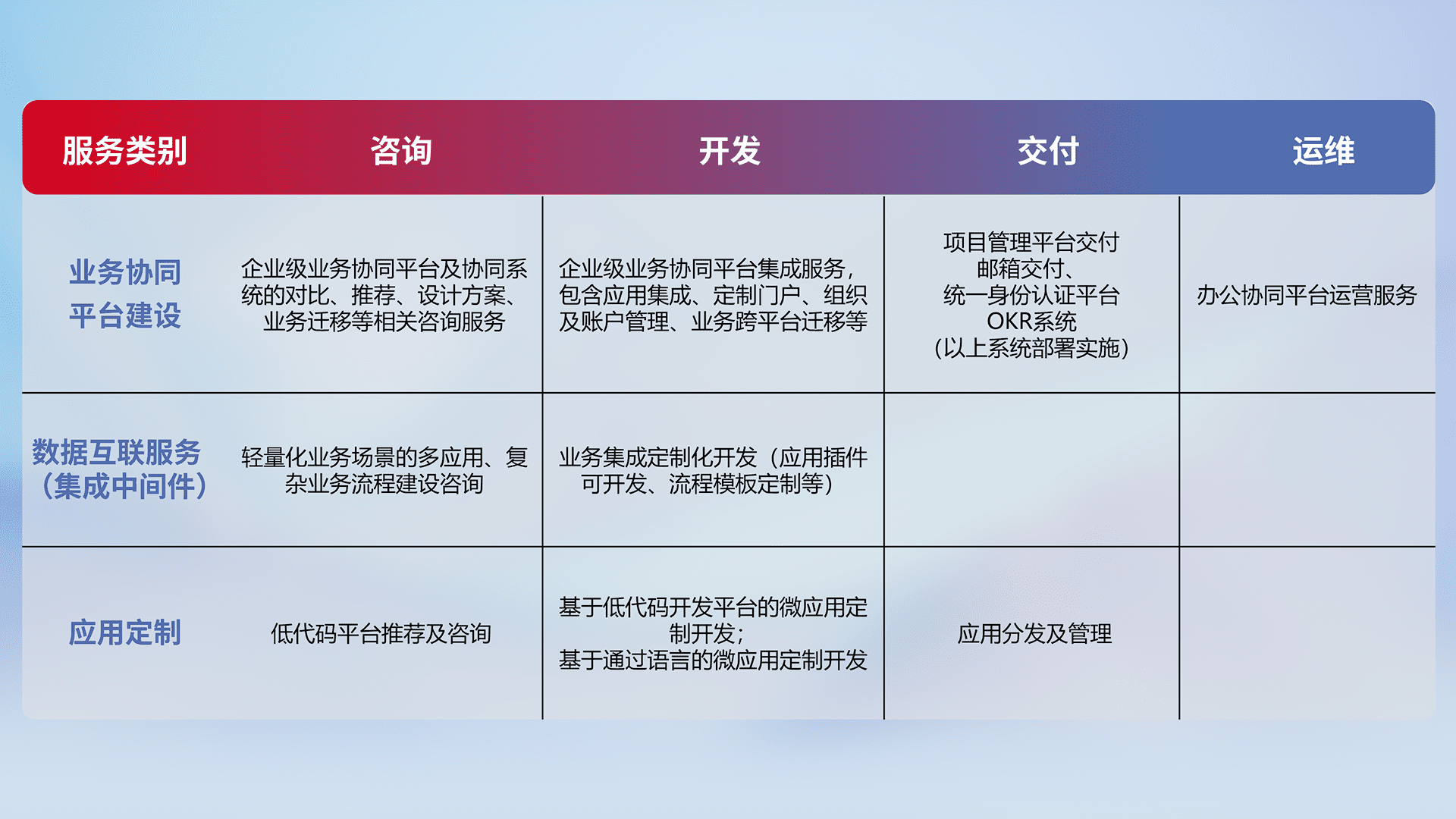 针对钉钉、、、企微、、IDaas等平台级产品提供产品的规划、、、方案、、、交付、、、定制化开发等服务,,实现如统一协同办公、、智能客户服务、、、混合会议管理、、智能数据查询、、等业务场景,,,,实现数字化转型。。。。