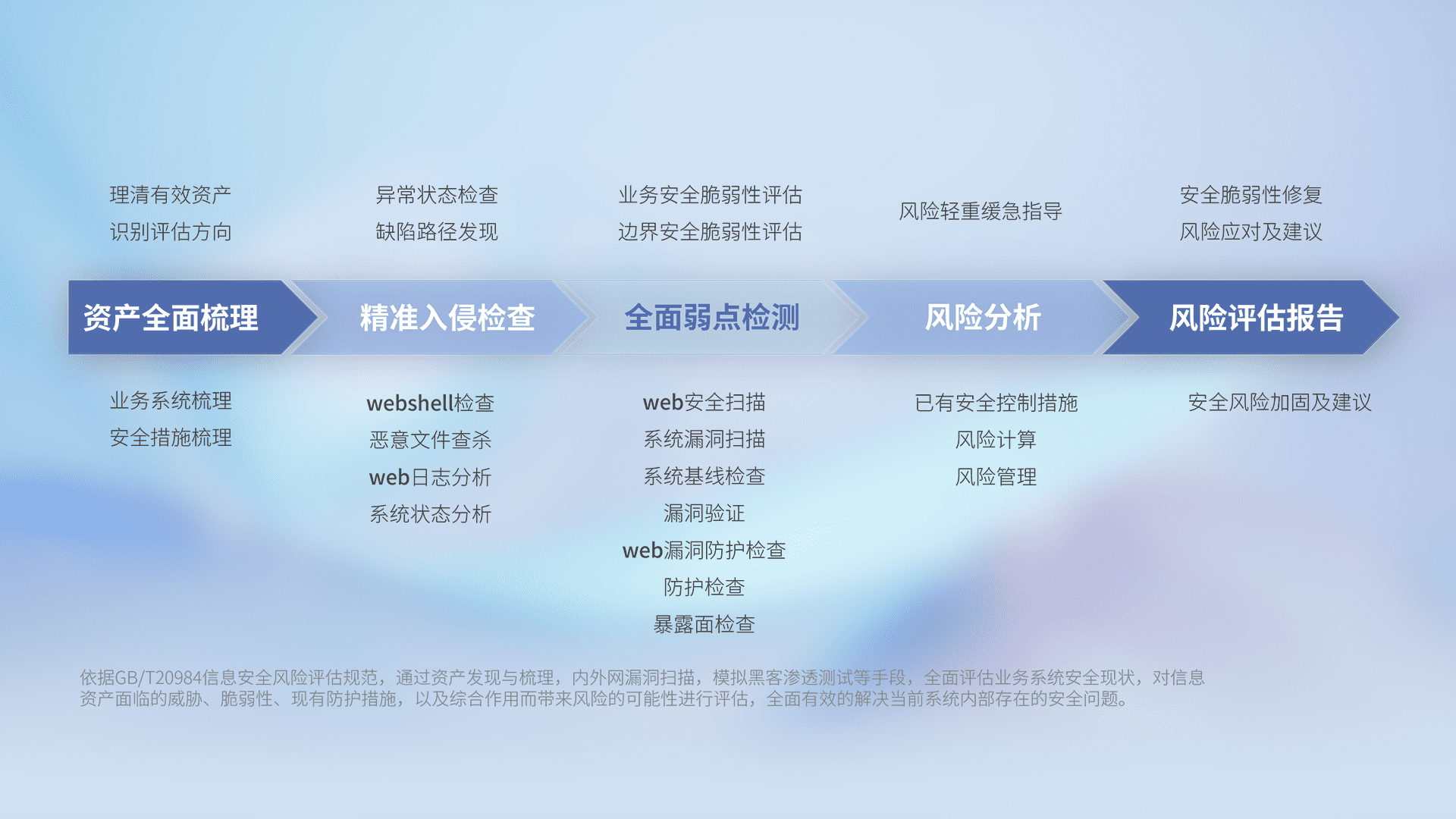 针对客户行业特性,,,,以专业的安全服务+多厂商联合解决方案提供专属的一站式安全管理服务,,,,帮助客户全面感知网络空间威胁,,,,基于识别、、、、检测、、、分析、、防护、、、监测、、、、响应的服务理论模型,,,,从方案咨询、、、集成交付、、评估验证、、、、优化加固、、、运维运营,,,,致力于为客户提供完整的闭环管理式安全服务。。以实战经验为客户打造高抵御风险的安全体系,,,,帮助客户发现威胁、、、对抗威胁、、、、处置威胁,,不断积累安全对抗能力,,持续保障数字化安全。。